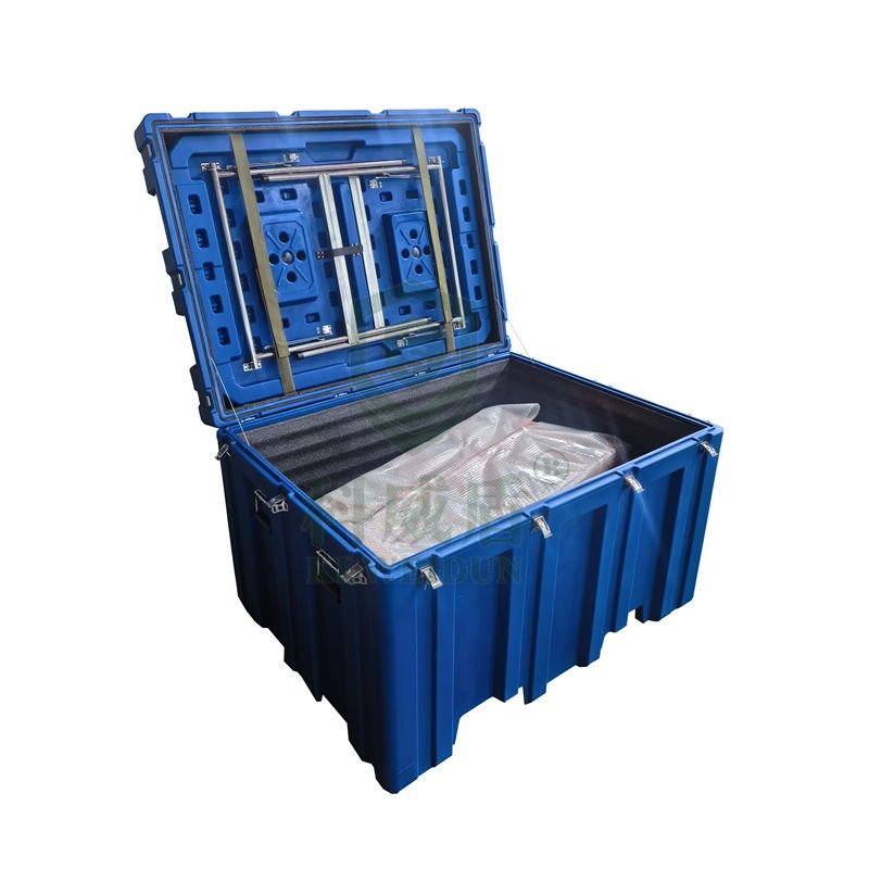 箱體結(jié)構(gòu):運(yùn)輸箱為上開蓋結(jié)構(gòu),箱體部分采用滾塑工藝一次成型,箱體裝有鎖扣、合頁等金屬配件,金屬配件均為304不銹鋼材質(zhì)。